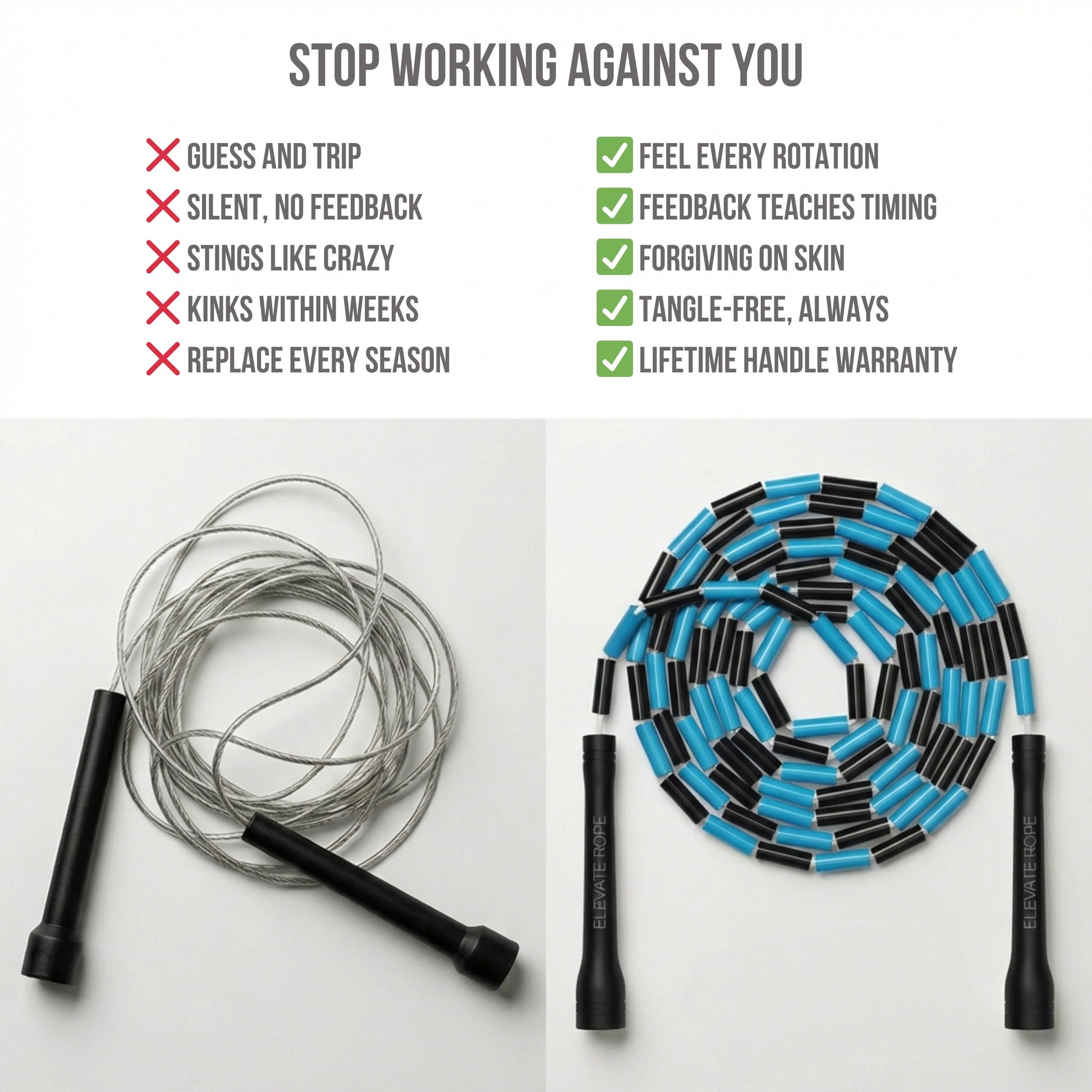 • A beaded rope has proven to be perfect for beginners, freestyle and any skills that require more feedback for better control.